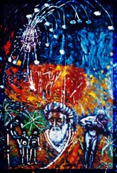 「進化の軌跡−時のサイクル」1993年にジャスムヒーンが、紙にガッシュ(不透明水彩絵の具)を用いて描いたものです。