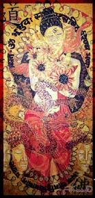 この作品もまた、複数の階層からなり、仏陀のイメージ、サンスクリット文字などが描かれています。